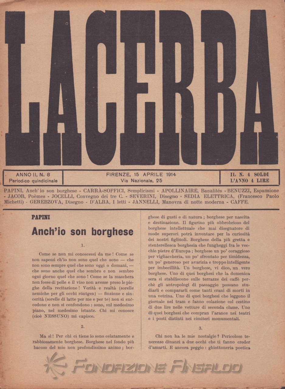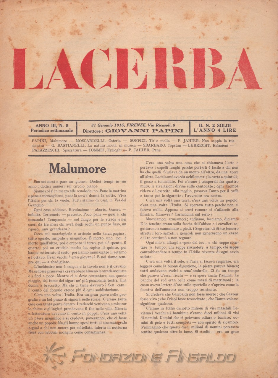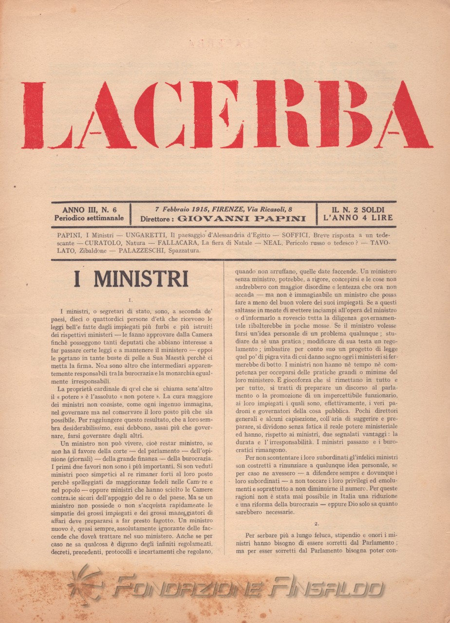 Dal 1915 il periodico esce con cadenza settimanale, Giovanni Papini assume la direzione unica della rivista, prima condivisa con Soffici, che peraltro continua a collaborare. Con il ritorno di Aldo Palazzeschi, a cui è affidata la rubrica fissa “Spazzatura”, la letteratura e l’arte rientrano sulle pagine di «Lacerba», accanto agli articoli politici.