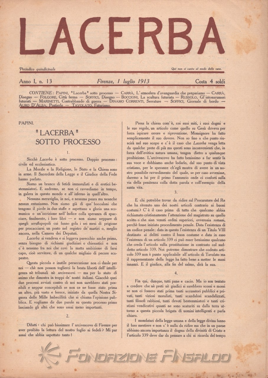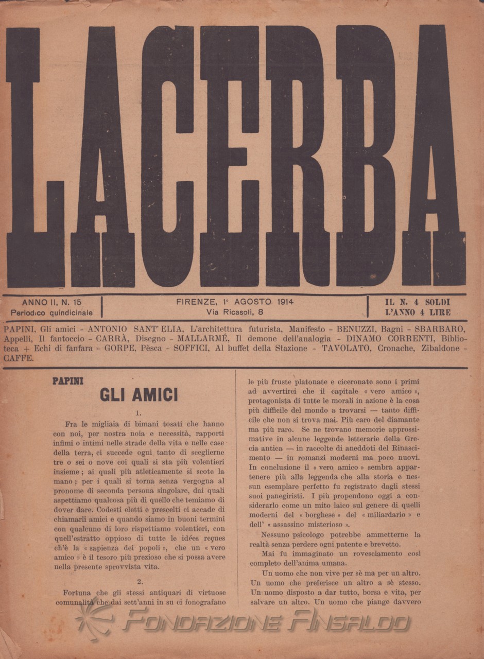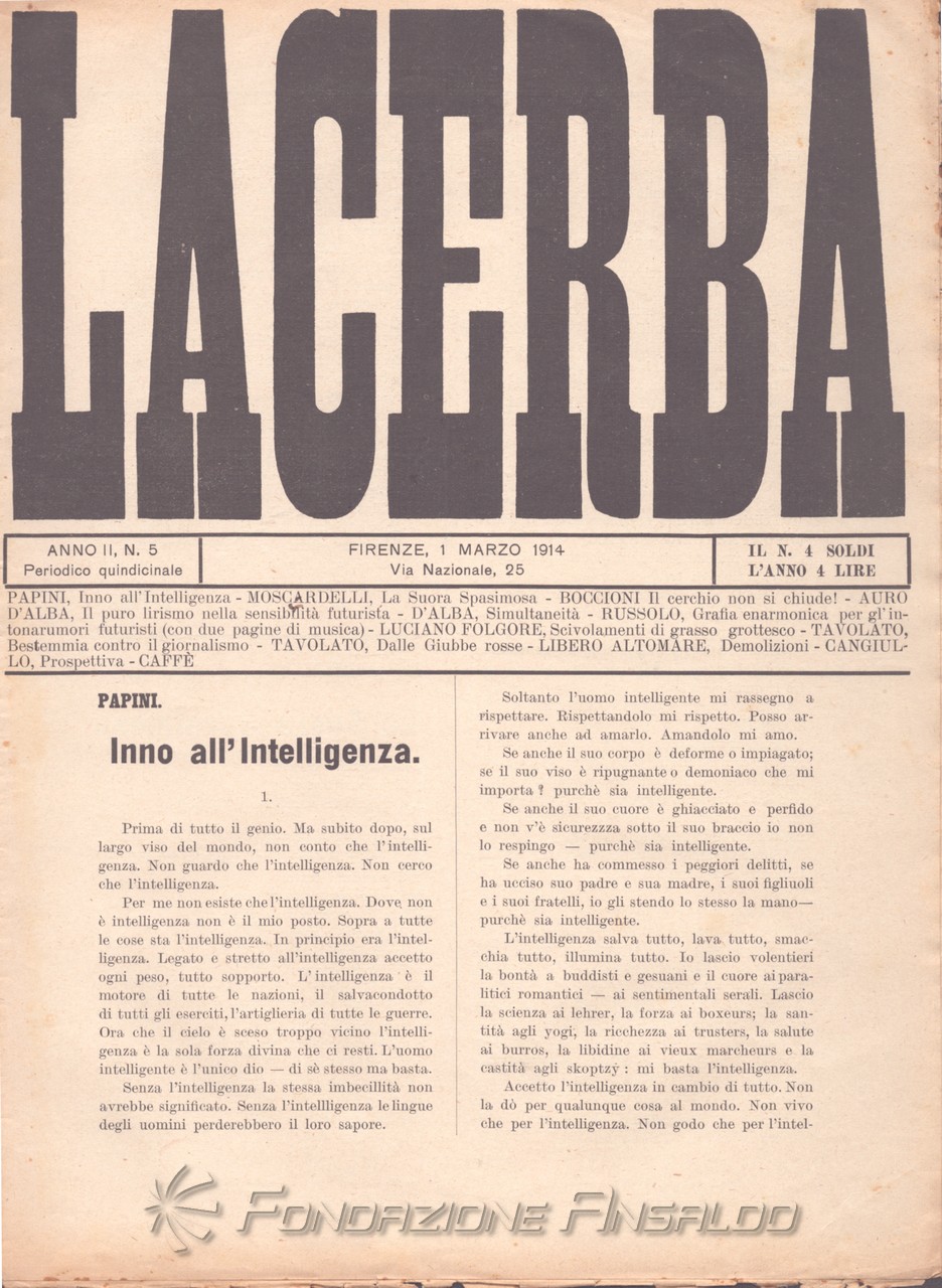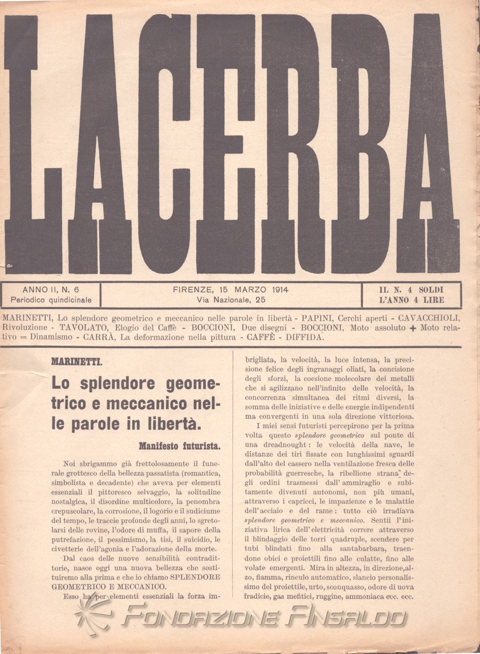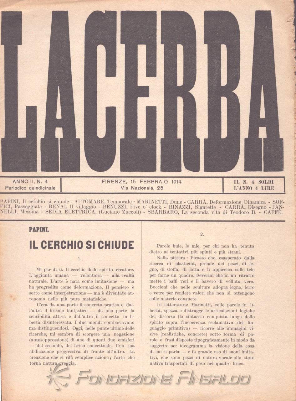 Sempre come rivista d'arte e di pensiero che intende portare il pubblico a conoscenza delle forme più avanzate dell'arte moderna, «Lacerba» pubblica, nel n. 15 del 1 agosto 1914, il “Manifesto dell'architettura futurista”. Tuttavia, il 15 febbraio precedente, Giovanni Papini aveva pubblicato sulla rivista il noto articolo "Il cerchio si chiude", polemico con il cosiddetto "marinettismo", considerato intriso di modernolatria: il culto o adorazione eccessiva della modernità, in particolare della tecnologia, della velocità, del progresso e della venerazione per la macchina.