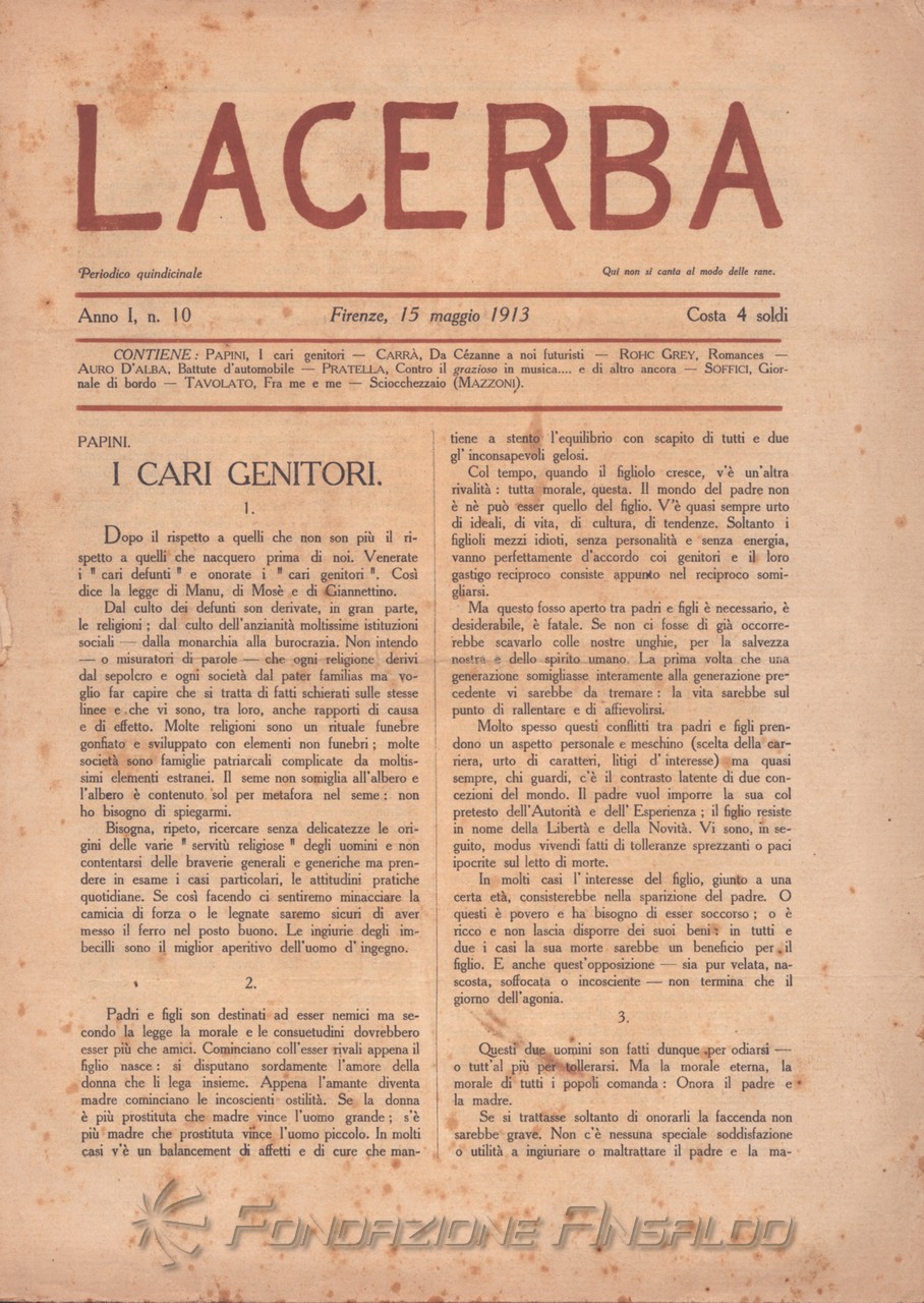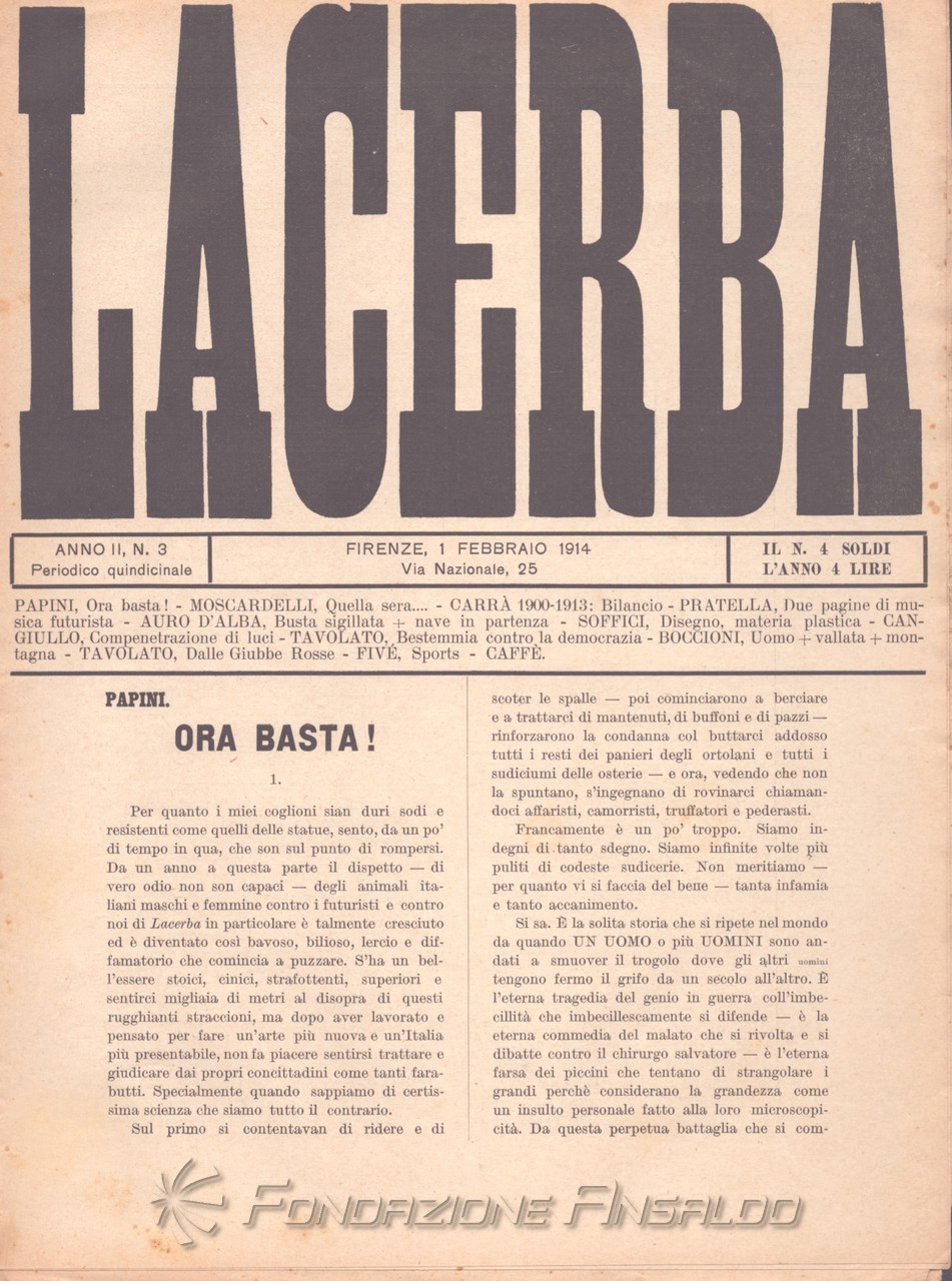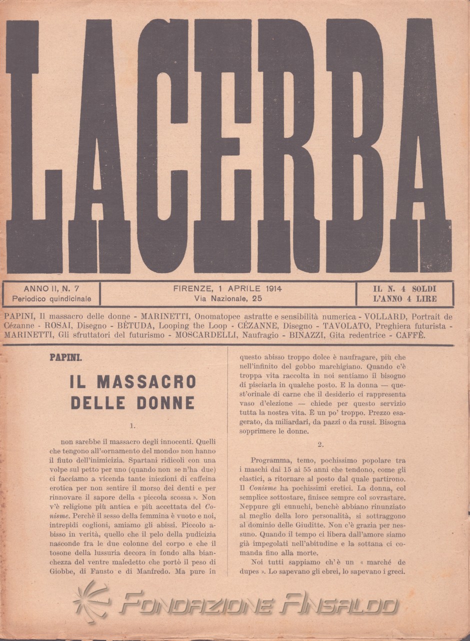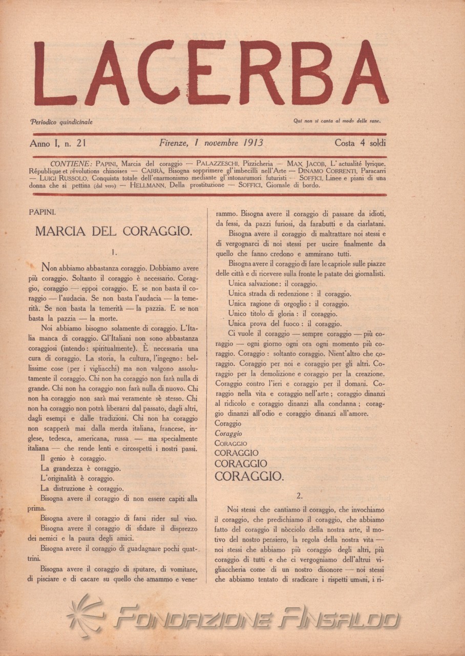 Lacerba è stata una rivista quindicinale letteraria italiana fondata a Firenze il 1 gennaio 1913 da Giovanni Papini e Ardengo Soffici, pubblicata dal gerente responsabile Guido Pogni fino alla fine del 1914 e successivamente da Pietro Gramigni, stampata dalla Tipografia di Attilio Vallecchi e C.
