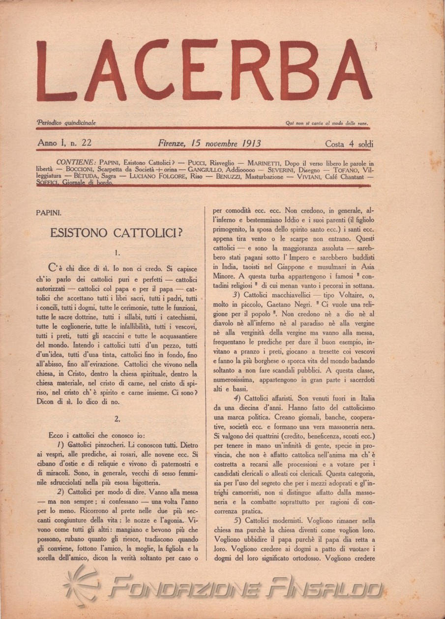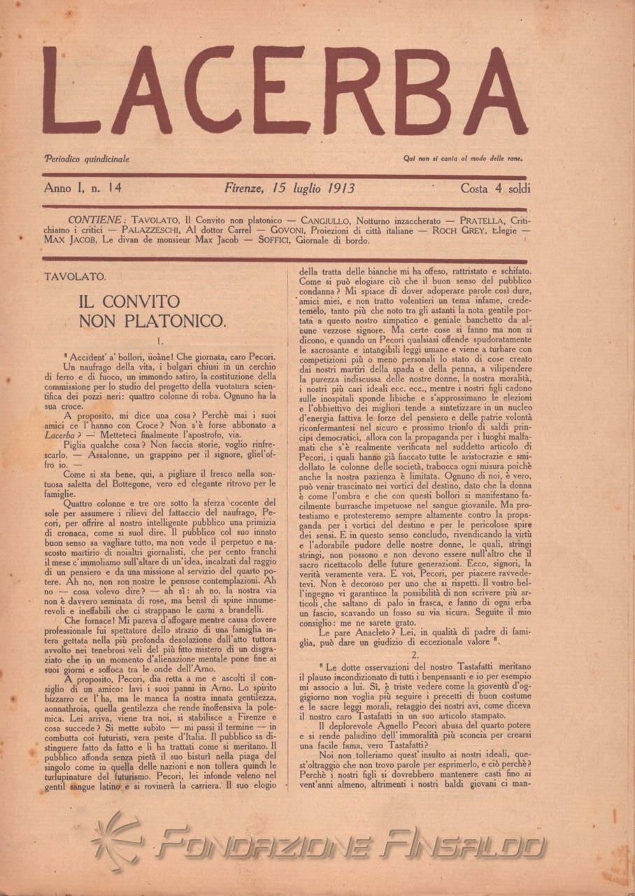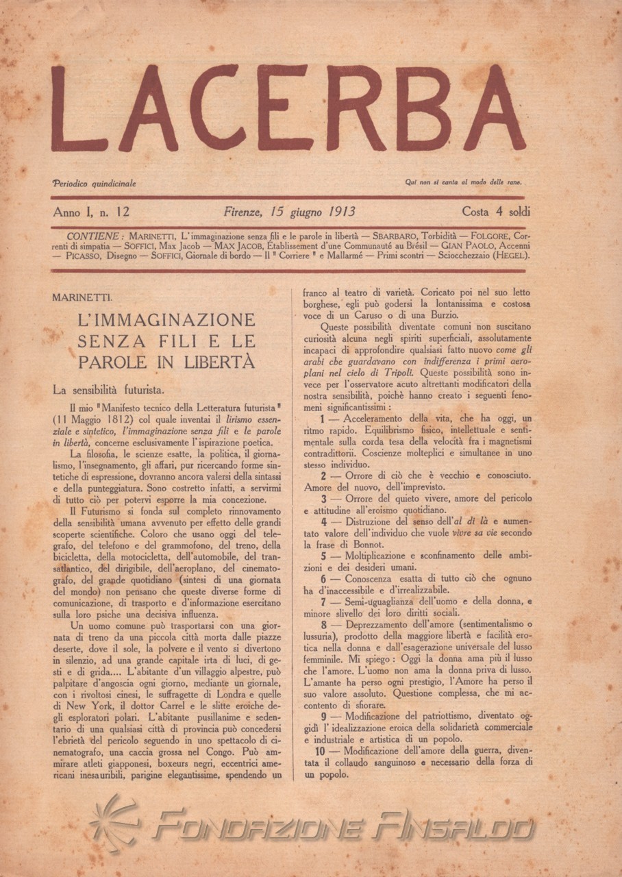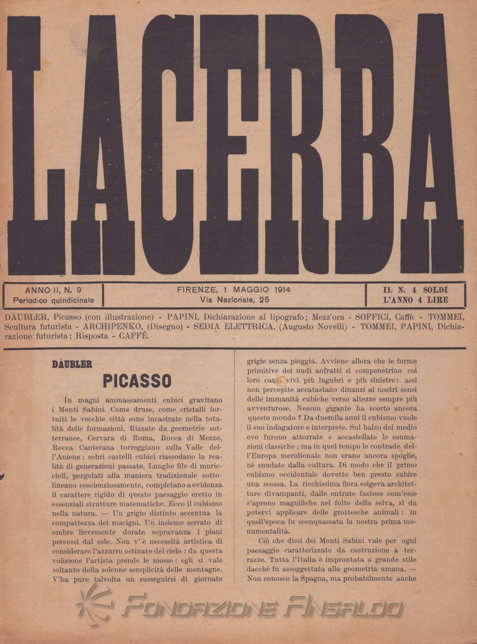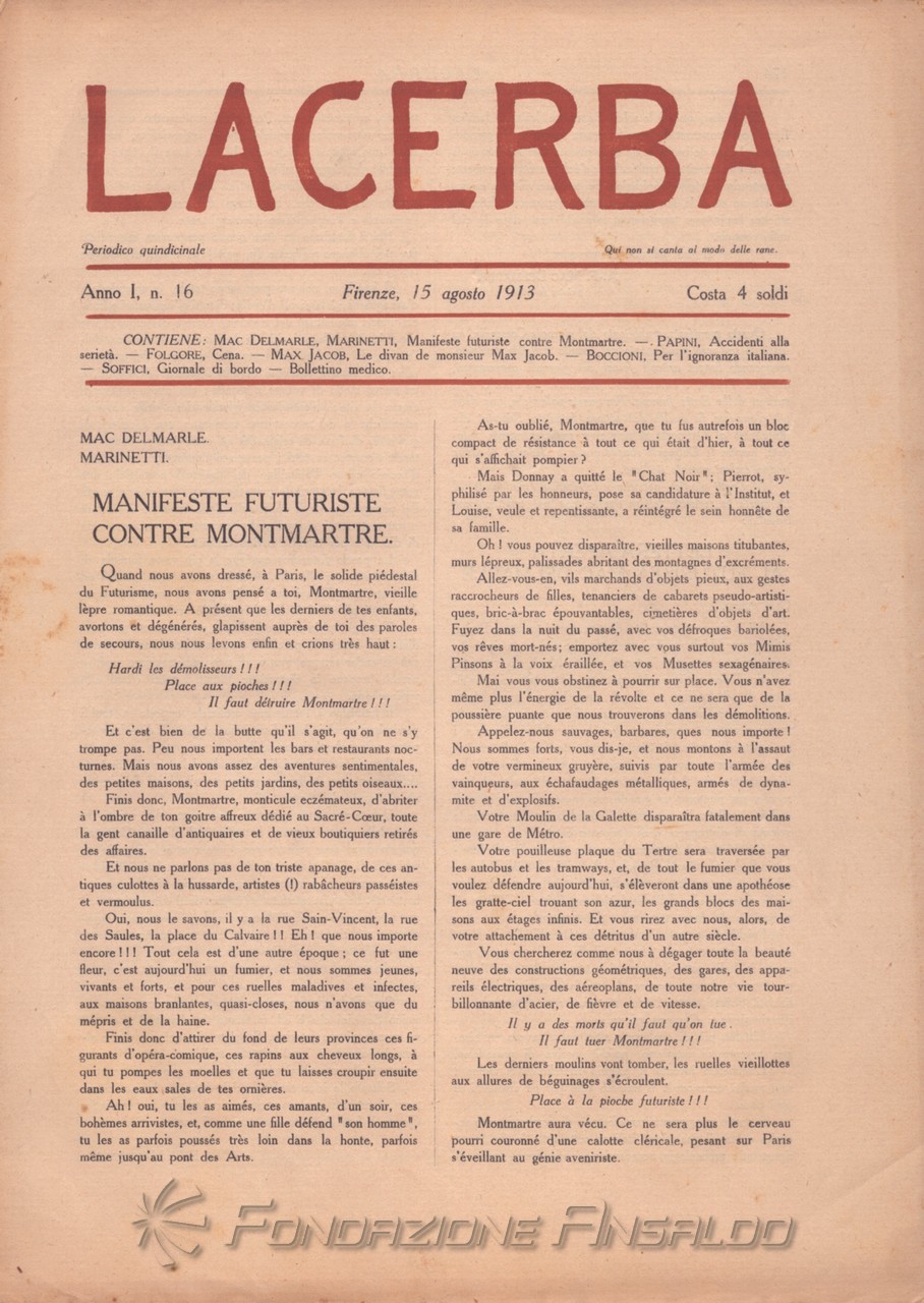 Lacerba è stata una rivista quindicinale letteraria italiana fondata a Firenze il 1 gennaio 1913 da Giovanni Papini e Ardengo Soffici, pubblicata dal gerente responsabile Guido Pogni fino alla fine del 1914 e successivamente da Pietro Gramigni, stampata dalla Tipografia di Attilio Vallecchi e C.