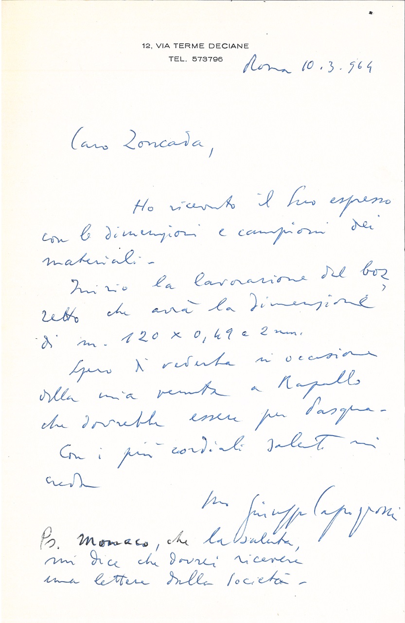 Il carteggio è relativo agli anni genovesi di Zoncada, dal 1948, anno del suo arrivo nella città ligure, al 1973 circa.