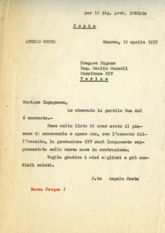 Tra i corrispondenti più ricorrenti figurano i pittori Luigi Spacal, Massimo Campigli (pseudonimo di Max Ihlenfeldt), Dino Predonzani e Federico Righi, gli scultori Marcello Mascherini, Ferruccio Quaia ed altri artisti, anche loro coinvolti nell’allestimento degli interni dei più celebri transatlantici e navi da crociera del periodo. Di alcune delle loro opere spesso sono presenti fotografie allegate alle lettere, oltre a schizzi e disegni appena abbozzati, alcuni dello stesso Zoncada, altri opera di terzi, tra i quali quelli attribuibili con certezza a Emanuele Luzzati con il quale l’architetto collaborò in più occasioni: la prima volta per la realizzazione degli interni dell'Andrea Doria per la quale Luzzati realizzò le decorazioni parietali per la sala dei bambini con immagini ispirate al mondo del circo, ed in seguito per l’Ausonia, per la Leonardo da Vinci e per la Oceanic. Sono inoltre presenti le specifiche tecniche degli ambienti progettati per le navi Oceanic, Stella Solaris, Michelangelo ed Eugenio C.