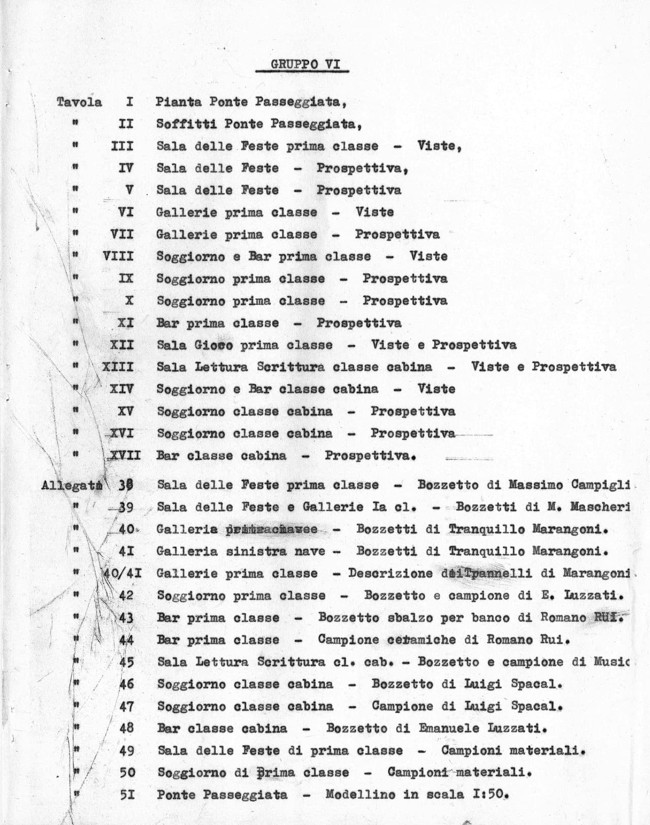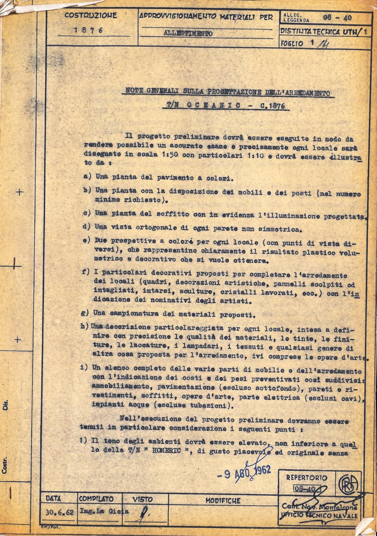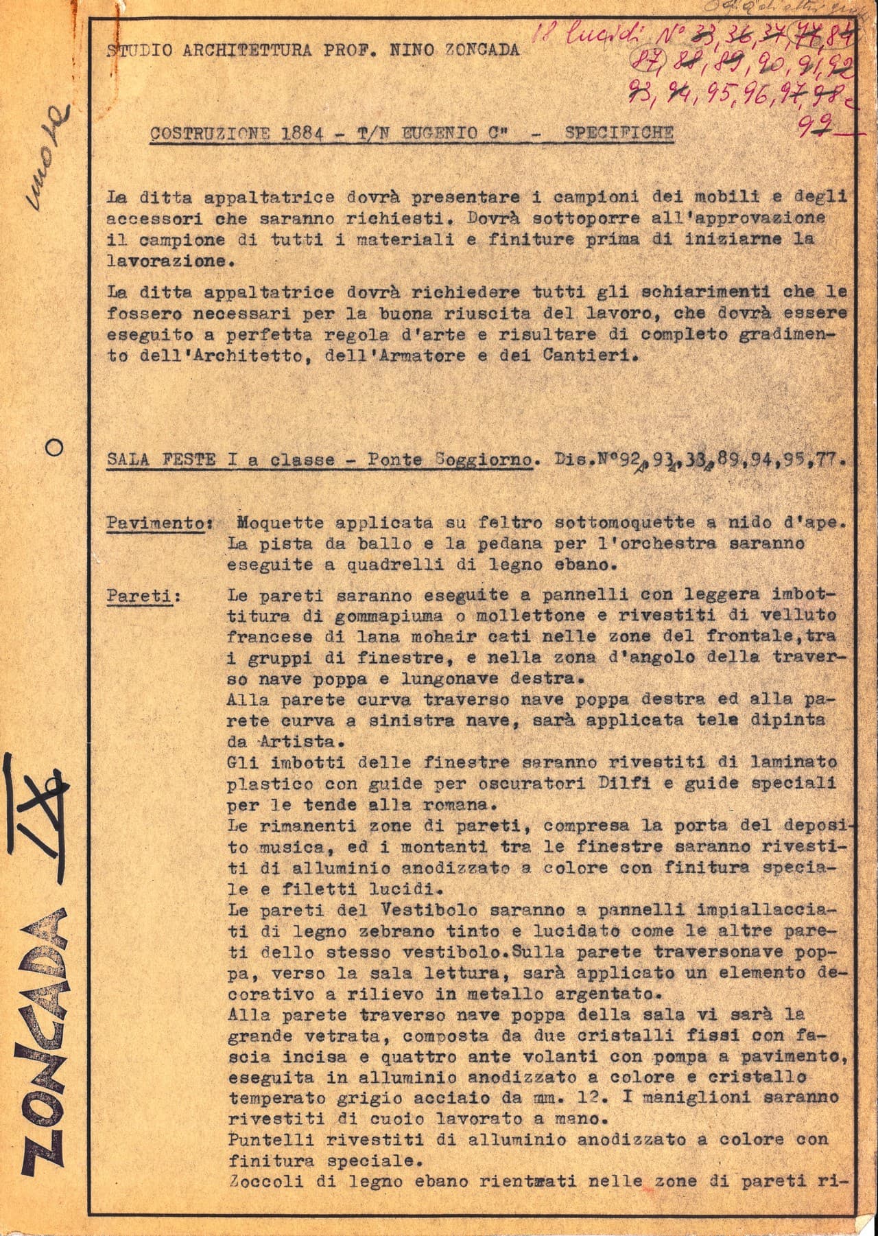 Specifiche tecniche e progetti di allestimento degli interni relativi ai lavori di arredo curati da Nino Zoncada per le unità Andrea C., Carla C., Eugenio C., Leonardo da Vinci, Michelangelo, Oceanic, Stella Oceanis e Stella Solaris.