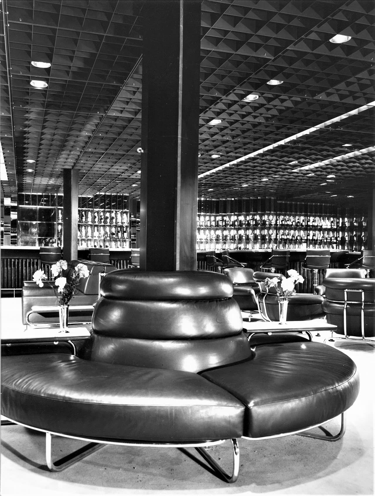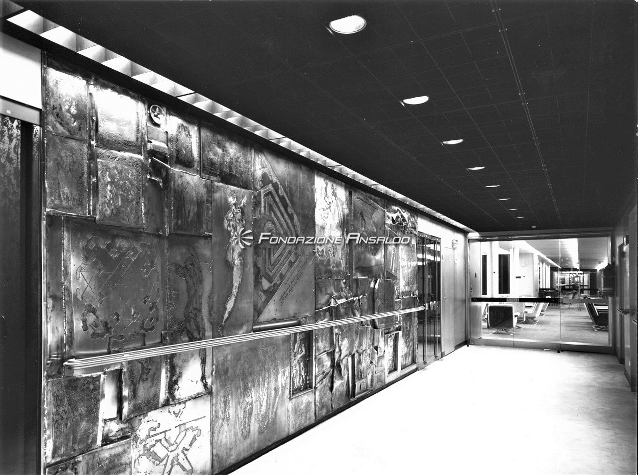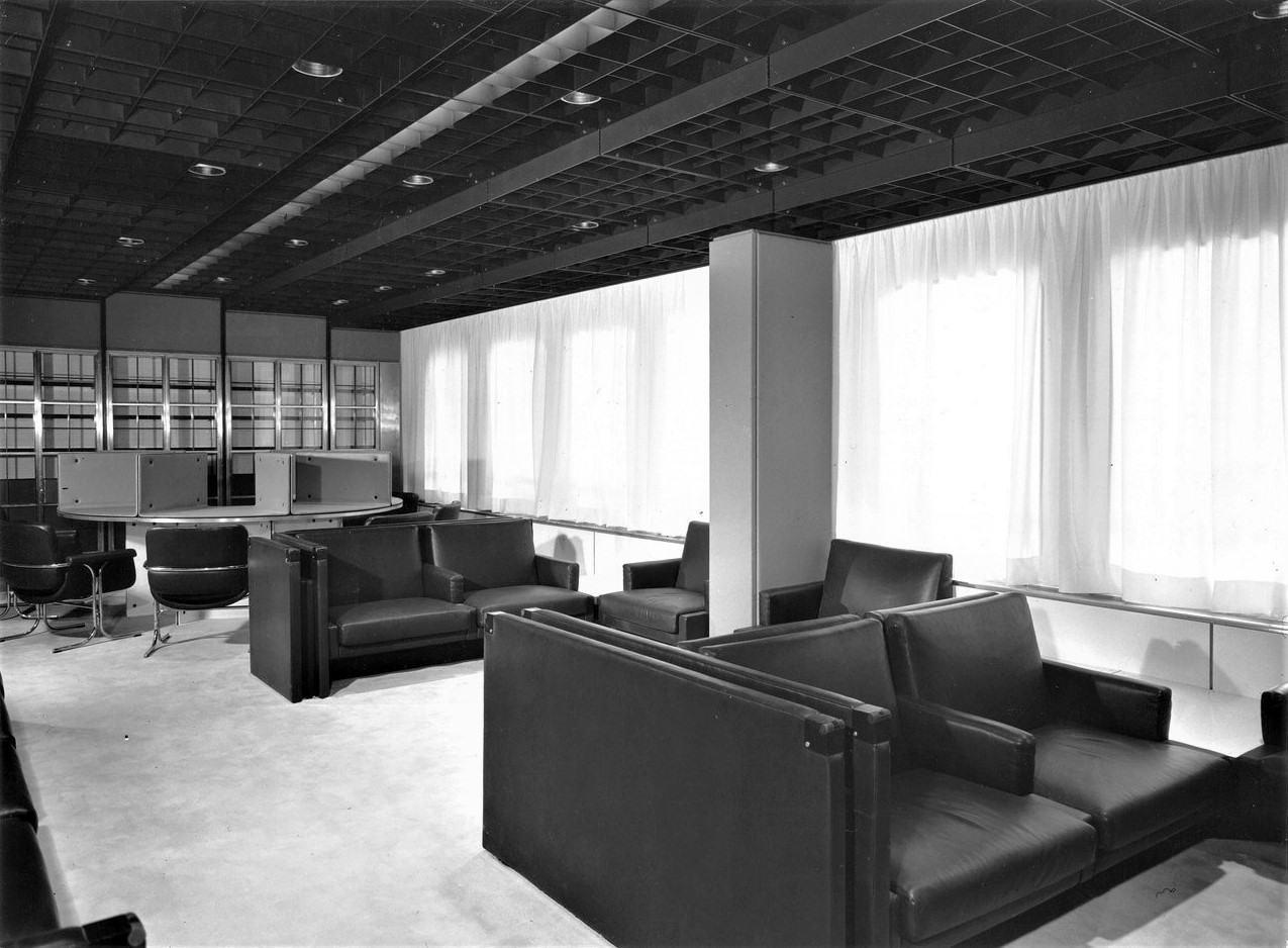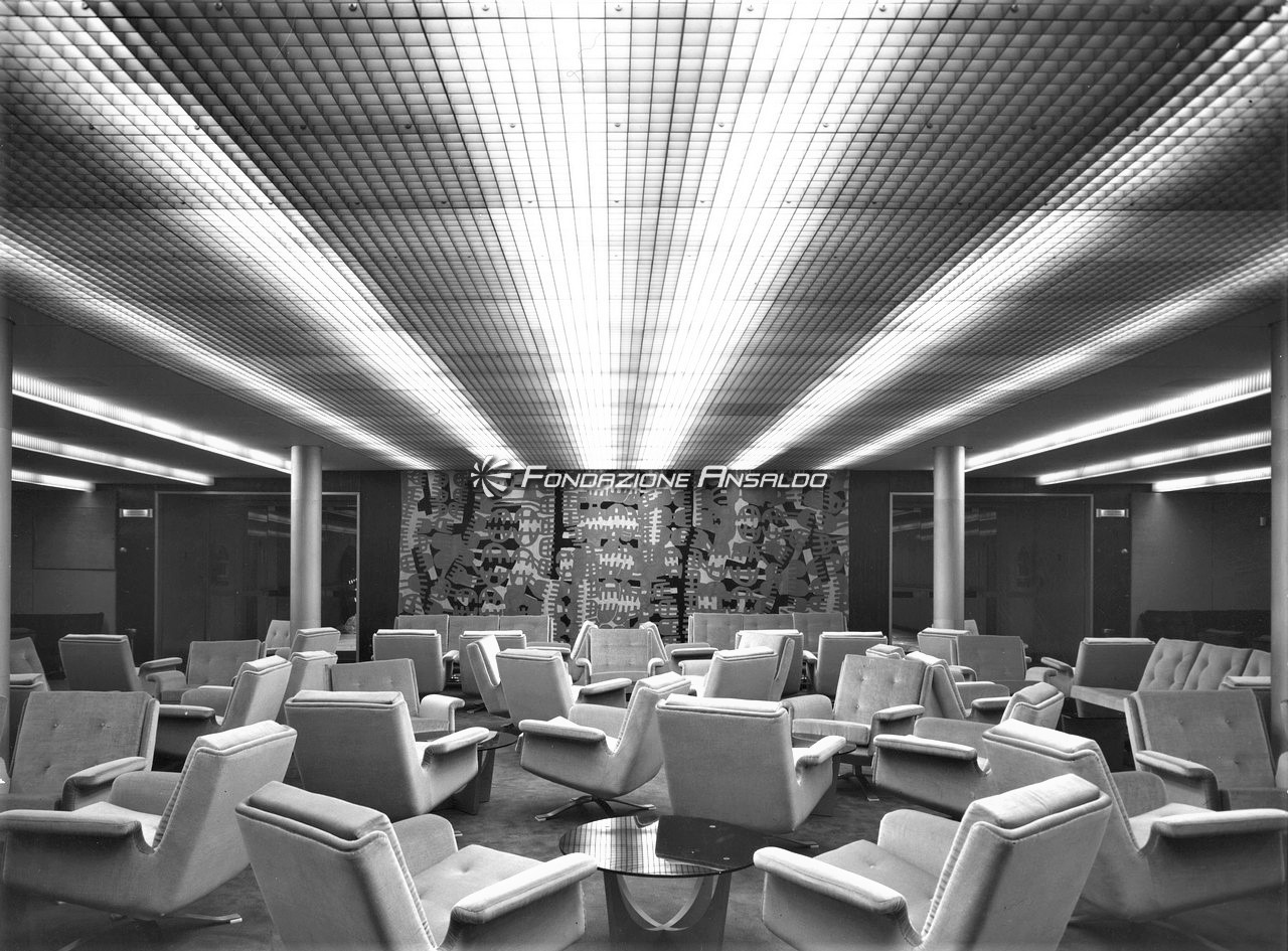 Le scelte architettoniche diedero un accento monumentale alla sala, smussato dall’estremo rigore delle line architettoniche, i lampadari erano in alluminio anodizzato argento antico, con cristalli sfaccettati e luci a incandescenza. Erano presenti cinque ampi arazzi che riproducevano gli antichi disegni fiamminghi degli arazzi feuille de choux, realizzati dall’impresa Scassa su cartoni di Tranquillo Marangoni. I divani e poltrone che arredano la sala erano in armatura metallica prodotti da Cassina e rivestiti di velluto di lana mohain di color caffè rosso rubino. L’illuminazione era assicurata da vetrate verso l’esterno che correvano per l’intera lunghezza della sala.