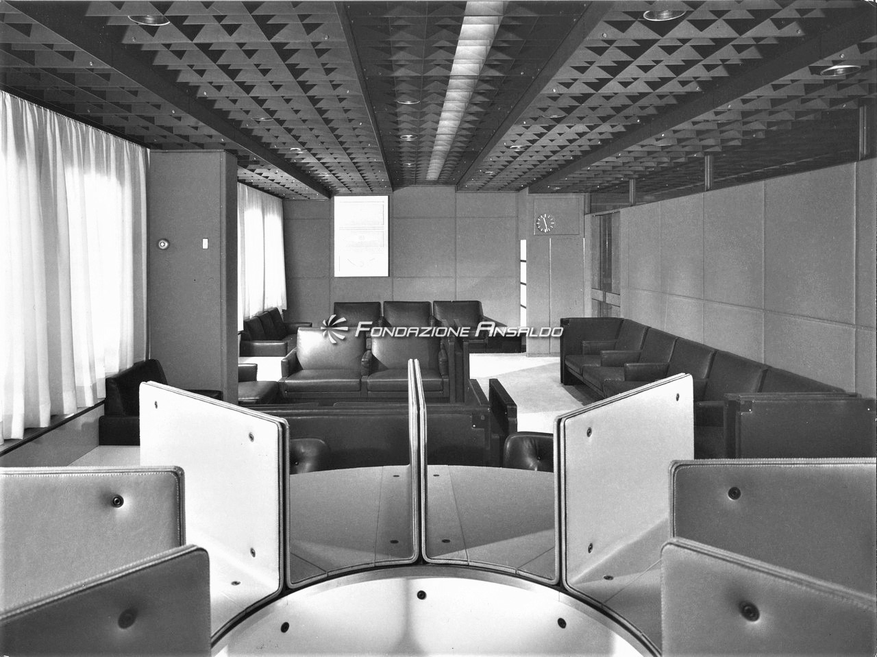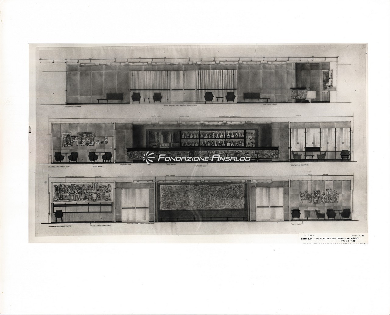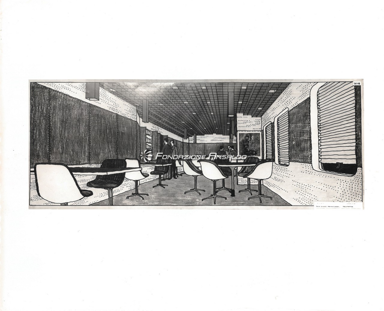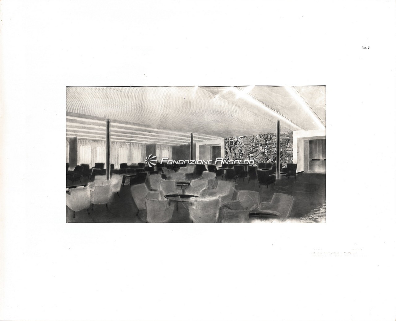 Nella sala di soggiorno era esposto sulla parete di prora un grande arazzo realizzato su disegno di Capogrossi dalla medesima arazzeria Scassa.