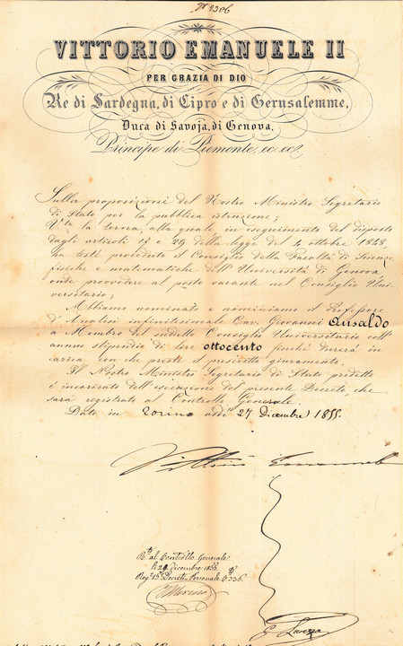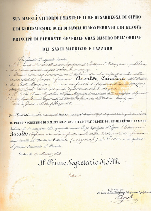 I titoli presenti ricostruiscono la carriera lavorativa dell'Ansaldo, dall'abilitazione all'insegnamento in matematica, a quella in meccanica applicata alle arti, a quella di analisi infinitesimale. I titoli ricevuti come quello di Cavaliere dei SS. Maurizio e Lazzaro rende ben evidente quanto Giovanni Ansaldo fosse stimato dalle alte sfere del regno sabaudo