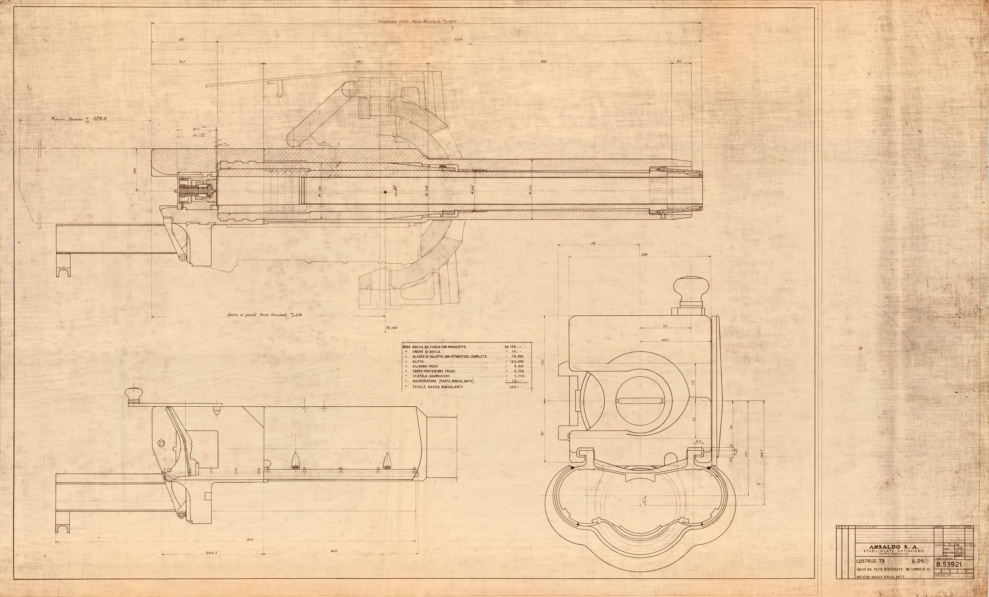 Obice da 75/18 su carro M13 - insieme massa rinculante