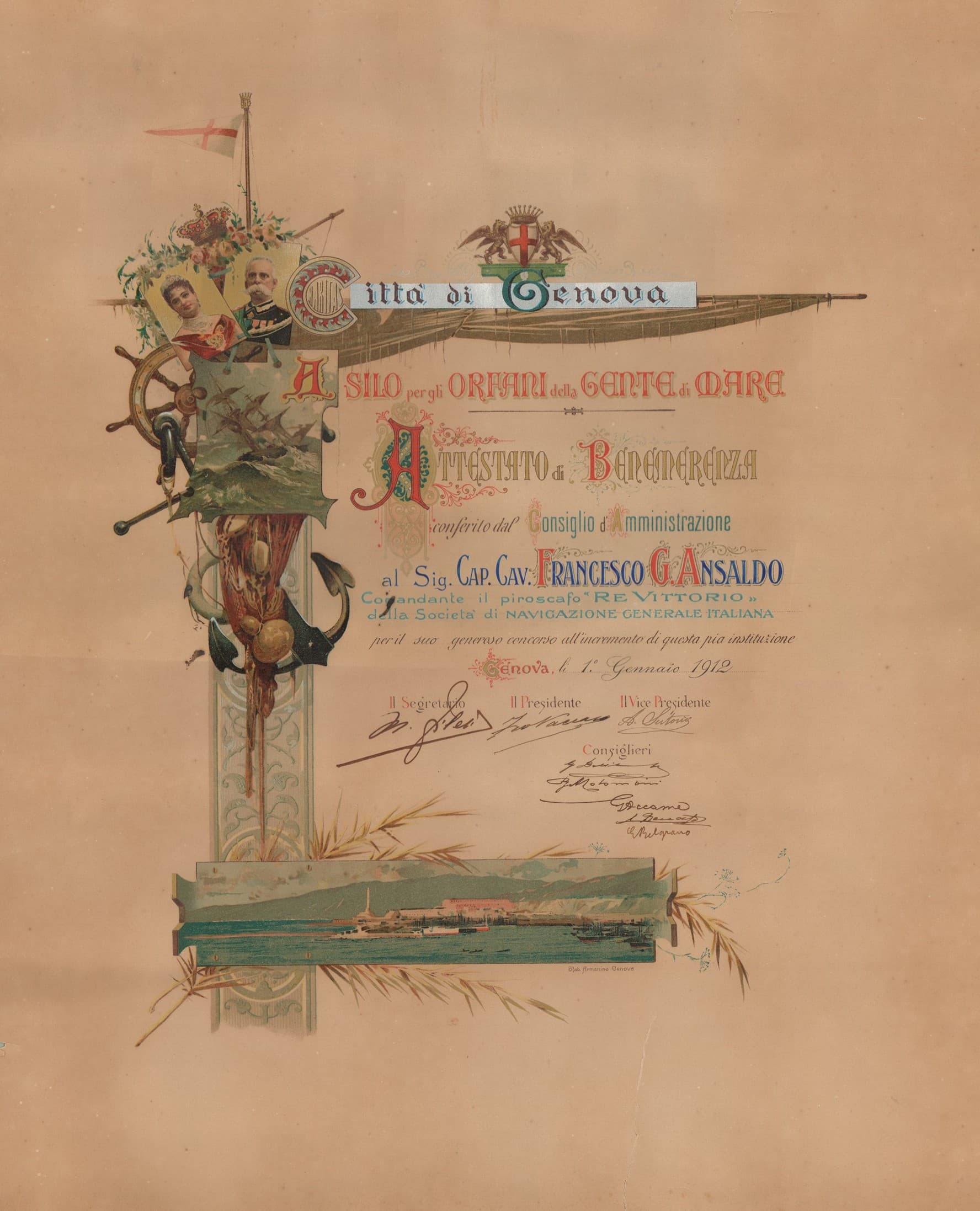 Attestato di benemerenza dell'asilo per gli orfani della Gente di Mare